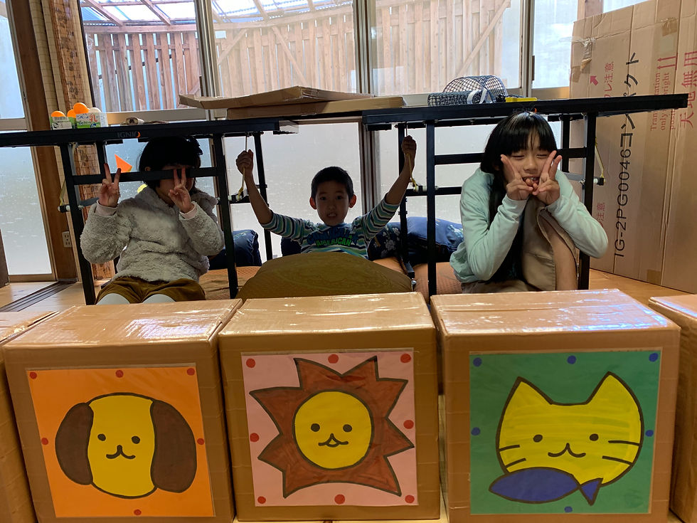 お勉強タイムが終わったら、お遊びタイムです‼️西の台小学校のダンボールハウスキャンプでFファミリーが作った動物将棋の駒をいただいたのでそれでおウチを作ったり、積み重ねてそれを崩す遊びに夢中なみんなです。