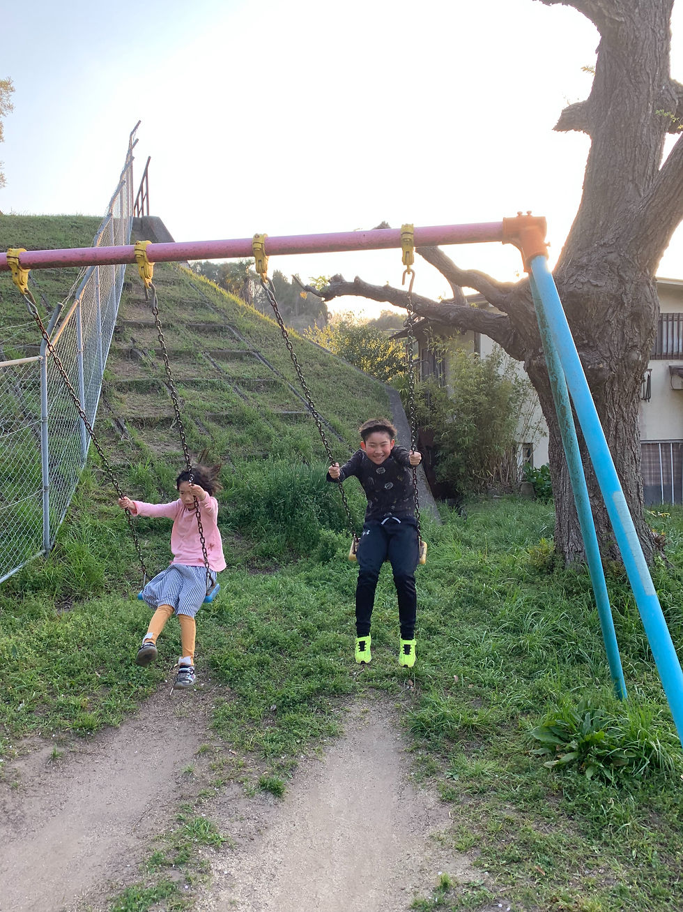 5時30分を過ぎて、公園に行きたいというので、行ってみると、寺子屋仲間のMちゃん、Sくん、Kちゃん兄妹が遊びに来てました。みんな一緒にブランコ、サッカーなどで遊びましたよ😄